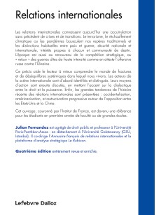 Ce précis aide le lecteur à mieux apprécier le monde de fractures dans lequel nous vivons. Les grands acteurs de la scène internationale sont d'abord identifiés et distingués. Leurs moyens d'action sont ensuite discutés, en mettant l'accent sur la dialectique entre le droit et la puissance. Enfin, les grandes tendances de l'histoire récente des relations internationales sont présentées (occidentalisation, américanisation, et restructuration progressive autour de l'opposition entre les États-Unis et la Chine).
