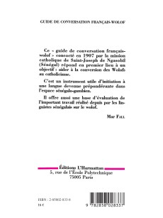 Ce guide des conversations Français -Wolof concocté en 1907 par la mission catholique de Saint-Joseph réponds en premier lieu à un objectif aider à la conversation des Wolofs au catholicisme. C'est un instrument utile de des initiation à une langue devenu prépondérante dans l'espace Sénégalo-gambien. Et l'offre aussi une base d'évaluation des lampes pour ton travail réalisé dit puis parler linguiste sénégalais sur le wolof.