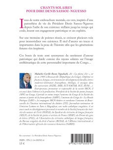 Issus de notre embouchure mentale, ces vers, inspirés d’une parenthèse de vie du Président Denis Sassou-Nguesso depuis l’aube de son existence stellaire jusqu’au temps qui coule, louent son engagement patriotique et ses exploits. Sur une trentaine de poèmes réunis, se croisent plusieurs voix pour immortaliser son existence. Il sied d’ancrer ses traces si importantes dans la peau de l’histoire afin que les générations futures s’en inspirent. Ces bouts de texte sont synonymes du sentiment d’amour patriotique qui darde comme des rayons solaires sur l’image emblématique de cette personnalité importante du Congo.