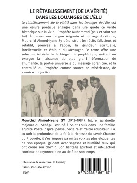Le rétablissement (de la vérité) dans les louanges de l'Élu est une œuvre poétique engagée dans une quête de vérité historique sur la vie du Prophète Muhammad (paix et salut sur lui). À travers une langue élégante et un regard critique, Mourchid Ahmed-Iyane Sy déconstruit les récits fallacieux et rétablit, preuves à l’appui, la grandeur spirituelle, intellectuelle et éthique du Messager. Ce texte offre une relecture éclairée de la biographie prophétique, mettant en exergue la naissance du plus grand réformateur de l’humanité, la portée universelle du message coranique, et la centralité du Prophète comme source de miséricorde, de savoir et de justice.