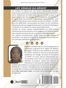 Les vendus du désert est une fiction romanesque d’origine testimoniale, qui relate l’incroyable odyssée d’un jeune Sénégalais, Karim. Dépité par la misère ambiante qui étouffe le pays, il se laisse éblouir par les mirages de l’immigration clandestine et se lance dans une aventure douloureuse, traumatisante, mais surtout infructueuse, qui le ramène au point de départ. En effet, dans les différentes communautés de destin où les conditions désastreuses de son voyage l’embarquent, il voit tout lui échapper : la liberté et la maîtrise du temps particulièrement. L’intérêt du roman repose essentiellement sur cette boucle initiatique qui enserre le récit, où le voyage en lui-même se donne à lire comme une leçon de vie, une source d’enseignements.