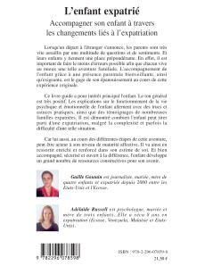 Lorsqu'un départ à l'étranger s'annonce, les parents sont très vite assaillis par une multitude de questions et de sentiments. Ce livre-guide a pour intérêt principal l'enfant. Les explications sur le fonctionnement de la vie psychique et émotionnelle de l'enfant alternent avec des trucs et astuces pratiques, ainsi que des témoignages de nombreuses familles expatriées. L'accompagnement de l'enfant grâce à une présence parentale bienveillante est le gage de son épanouissement au cours de cette expérience originale.