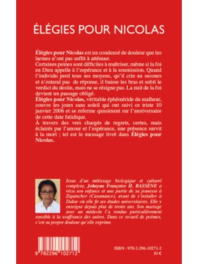 Elégies pour Nicolas est un condensé de douleur que les larmes n'ont pas suffit à atténuer. Véritable éphéméride du malheur, ce recueil couvre les jours sans soleil qui ont suivi ce triste 10 janvier 2006 et se referme quasiment sur l'anniversaire de cette date fatidique. A travers des vers chargés de regrets, certes, mais éclairés par l'amour et l'espérance, une présence survit à la mort ; tel est le message livré dans ces poèmes.